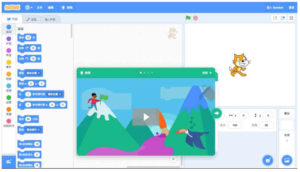 04 Scratch 3.0提供了一些教程,你可以单击播放,或者直接关闭,开始自己的编程。