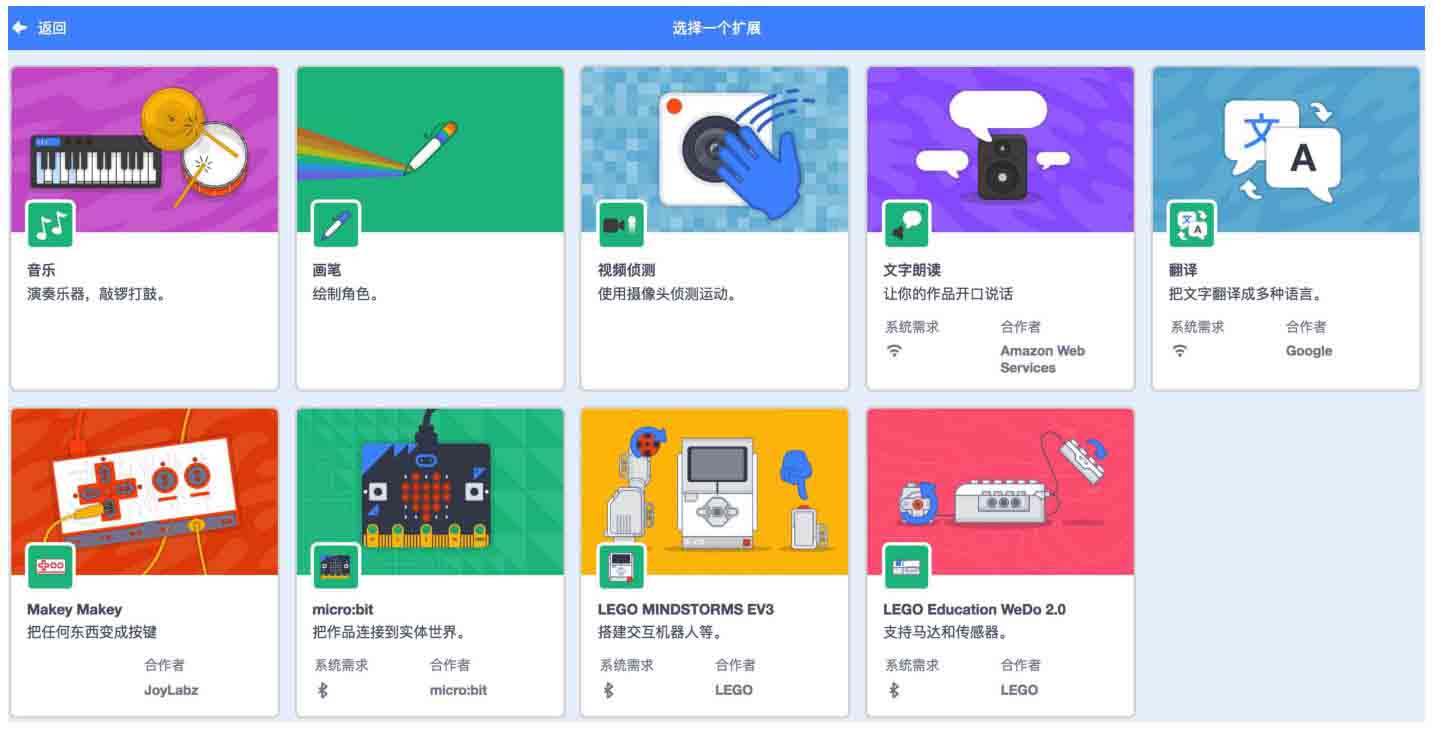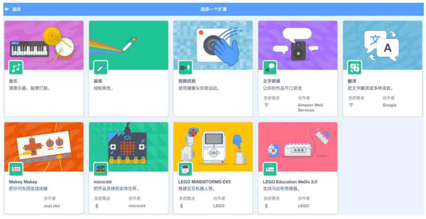 Scratch 3.0将 音乐 、 画笔 、 视频侦测 放进了扩展功能区,还增加了不少新的扩展功能,如 文字朗读 、 翻译 、 Makey Makey 、 micro:bit 、 LEGO MINDSTORMS EV3 、 LEGO Education WeDo 2.0 。
