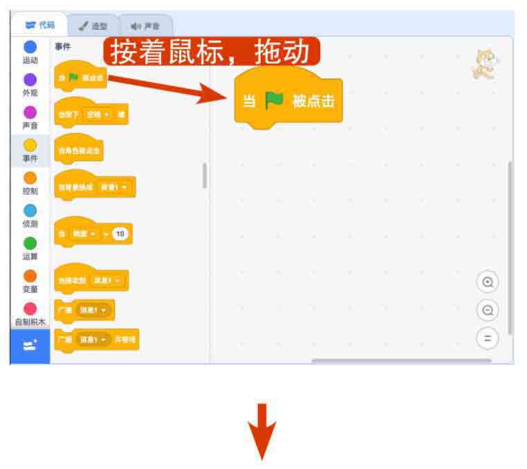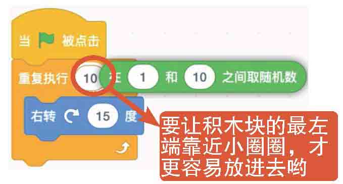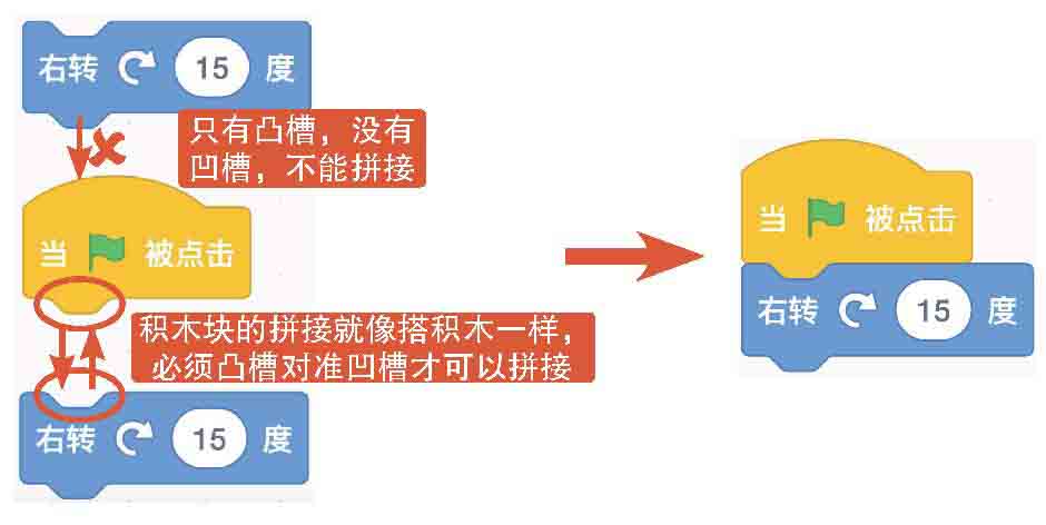 如何拼接上去呢?直接将积木块拖曳脚本区,它们可不会自动拼接哟。