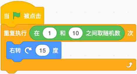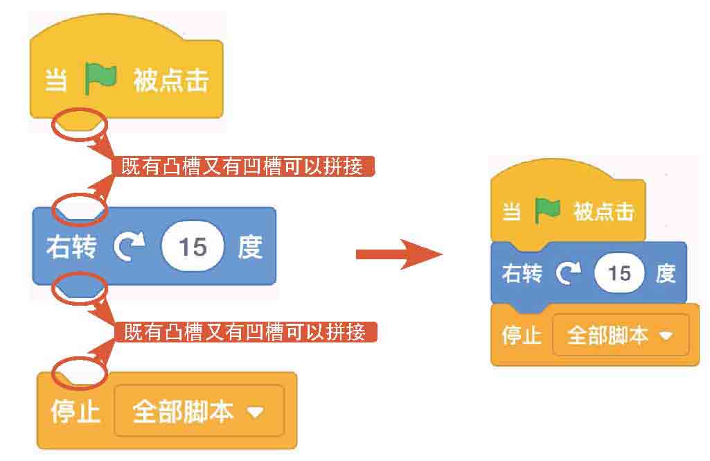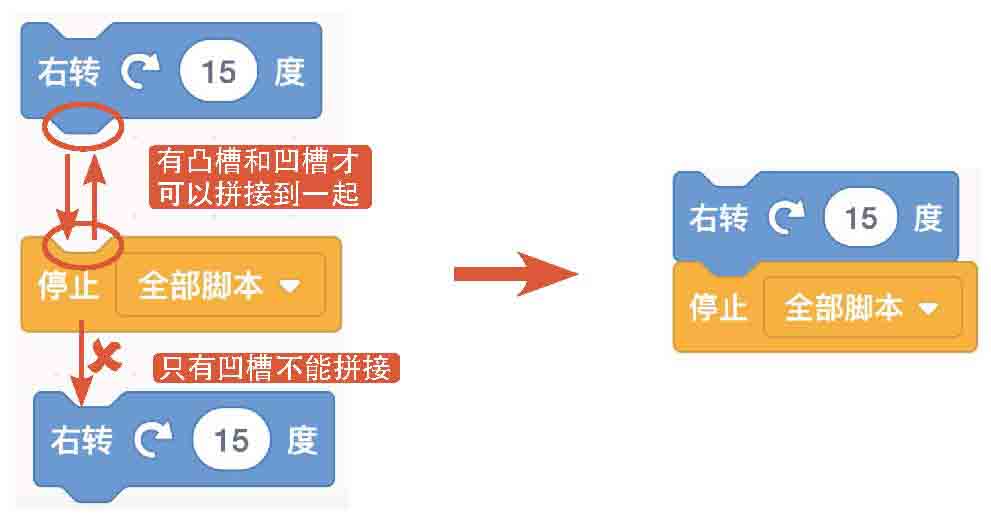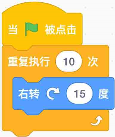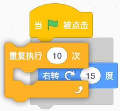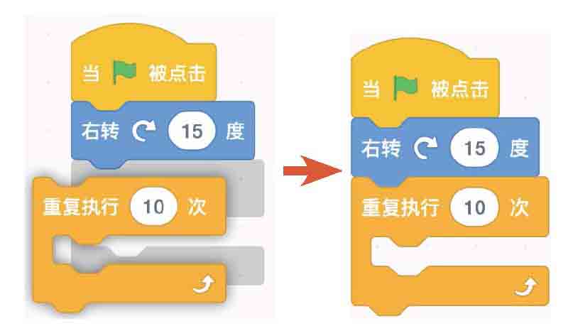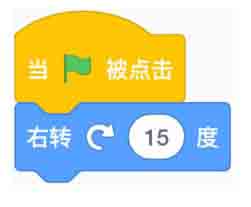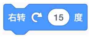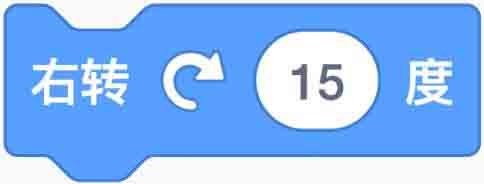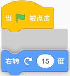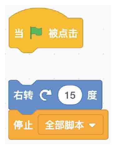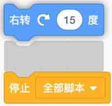 拖曳 右转15度 积木块,会将 停止全部脚本 积木块一起拖曳。
