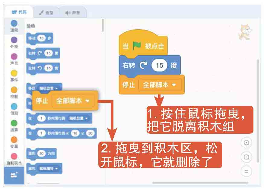(2)将要删除的积木块拖曳到积木区,松开鼠标,它就删除了。