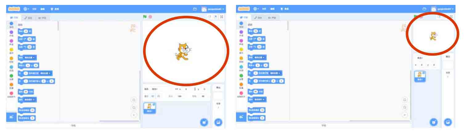 单击积木区的积木块,观察舞台区中小猫咪角色的变化。