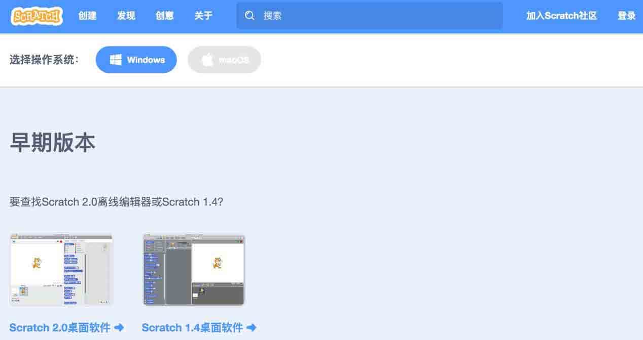 在软件下载页面:https://scratch.mit.edu/download,拖曳滚动条到网页底部,你可以看到Scratch之前版本的下载链接。如果想看看Scratch版本的变化或者想学习Scratch的其他版本,就可以在这里选择下载。