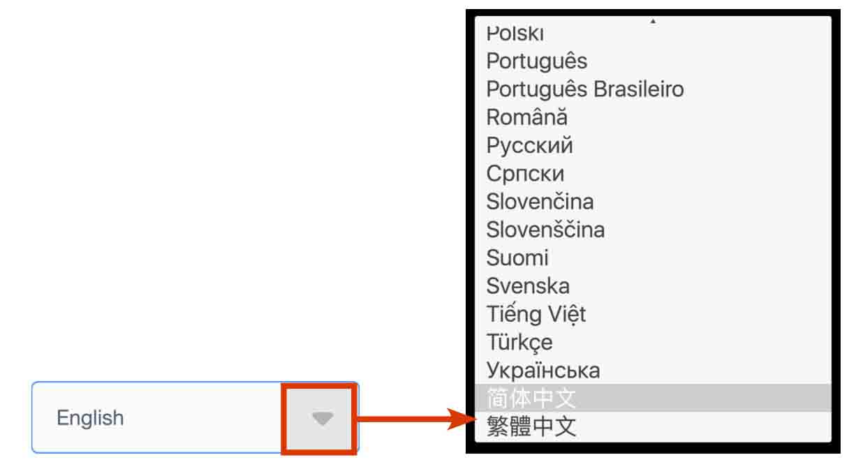 03 找到网页底部的下拉框,单击倒三角,滚动鼠标,选择你擅长的语言,比如 简体中文 。