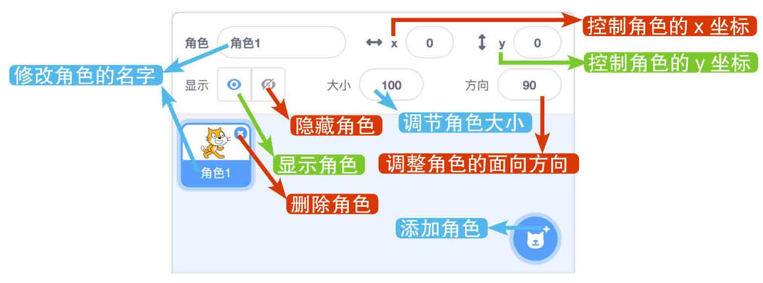 舞台区中的所有角色都会有一个缩略图放在角色列表区域。在角色列表中,记录着角色的相关信息。可以控制它的坐标位置、调节它的大小、调整它的方向等。