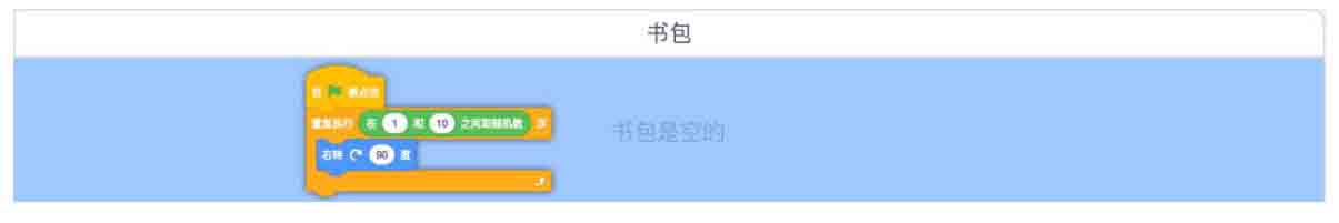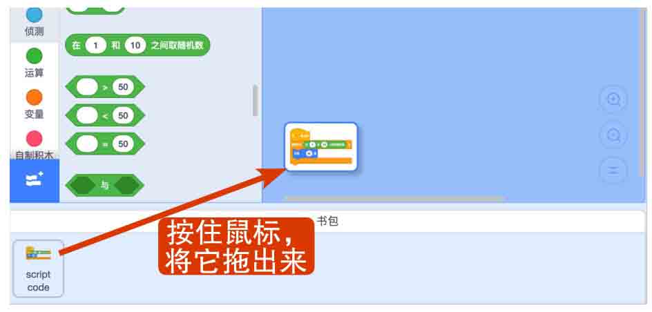 05 想要使用书包里面的代码块,只需要打开书包,把它拖曳到脚本区就可以了: