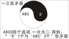这个思维过程就是将正向解题与逆向解题相结合,从题干突破与从选项突破相结合,从形式突破与从内容突破相结合,求同与求异相结合,从一三型矛盾突破。