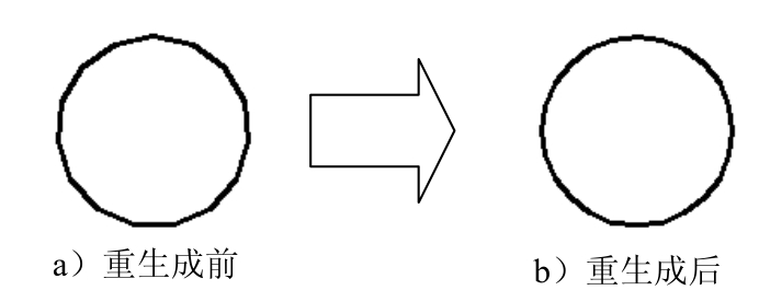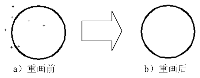 在创建图形时,有时为了突出屏幕图形显示的完美性,要用到重新绘制或重新生成图形的命令来刷新屏幕图形的显示。例如在屏幕上指定一点时,完成命令后可能会有小标记遗留在屏幕上(当系统变量BLIPMODE打开时),此时可以通过“重画”命令去掉这些元素(图1.7.1);再如缩放图形时,有的圆或圆弧会出现带棱角的情况,利用“重生成”命令即可使圆或圆弧变得圆滑起来(图1.7.2)。