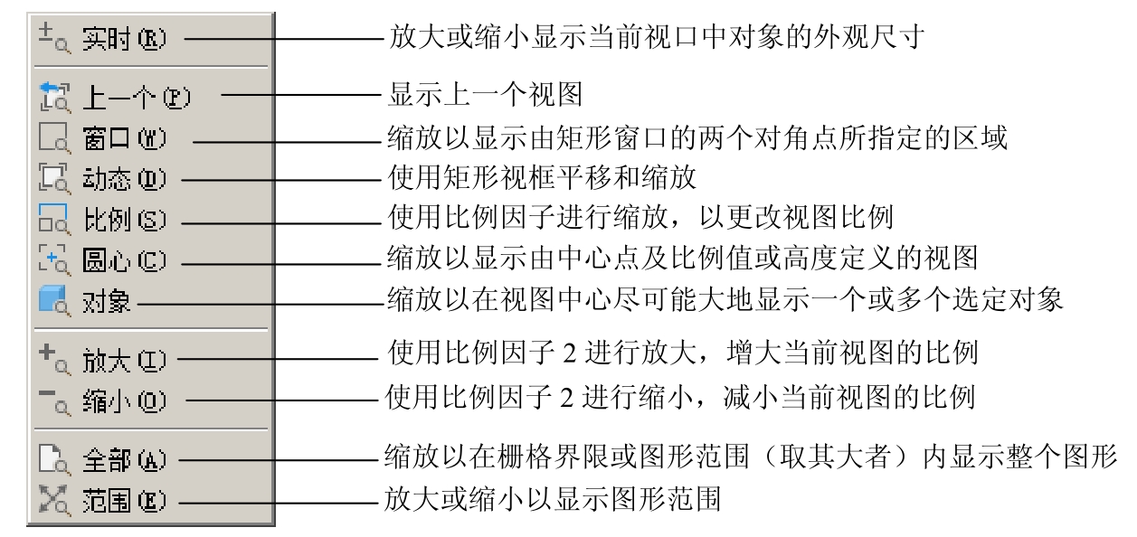 命令中的相应子命令(图1.8.1是缩放的子菜单命令),均可以方便地缩放视图。下面将介绍如何使用ZOOM命令进行图形的缩放。