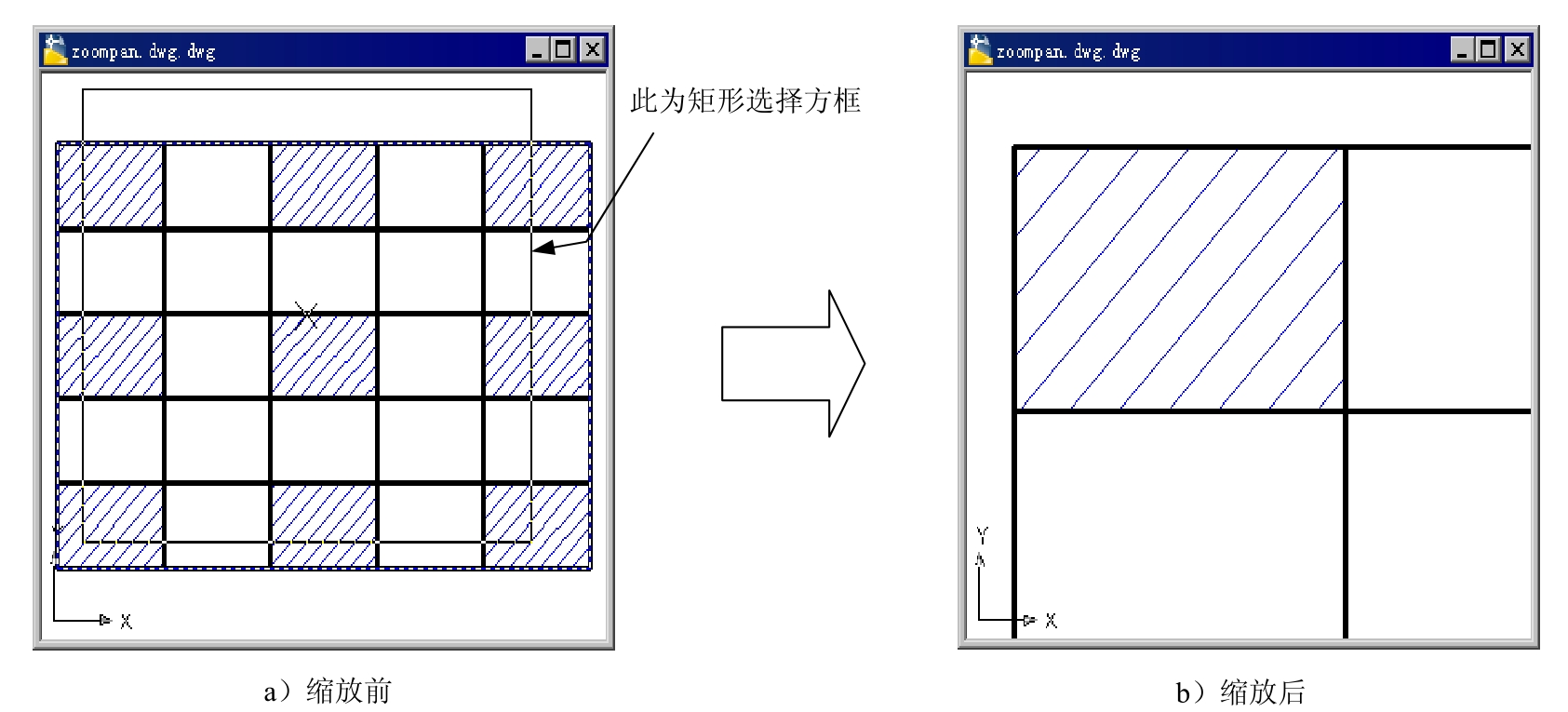 ,在此提示下,在图形中指定另一点作为窗口的对角点,如图1.8.3a所示。此时系统便将以这两个角点确定的矩形窗口中的图形放大,使其占满整个绘图区。完成操作后,绘图区的显示如图1.8.3b所示。