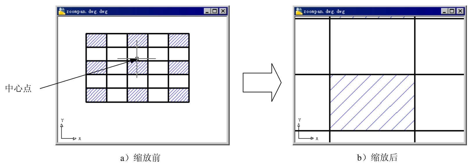 该选项通过重设图形的显示中心和缩放倍数,使得在改变视图缩放的比例后,位于显示中心的部分仍保留在中心位置,它与图1.8.1中的