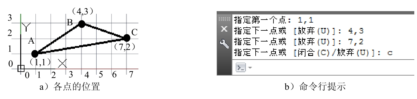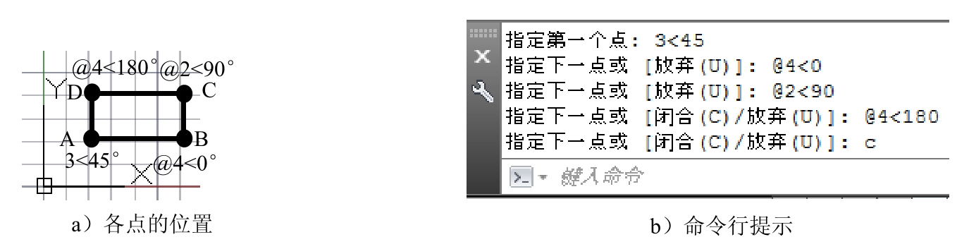 命令,分别输入A点的绝对极坐标与B、C、D三点的相对极坐标值(3<45)与(@4<0)、(@2<90)、(@4<180),然后输入字母C,此时在绘图区中可得到封闭的图形。命令行提示如图3.1.4b所示。
