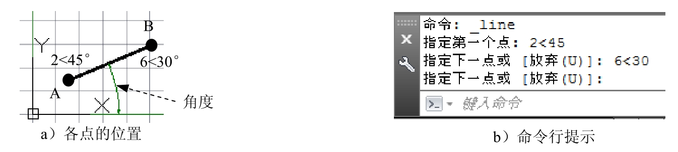 命令;输入点A的绝对极坐标值(2<45)后按Enter键;输入点B的绝对极坐标值(6<30)后按Enter键;按Enter键结束操作。命令行提示如图3.1.3b所示。