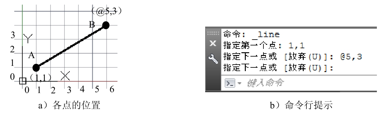 命令;在命令行中输入点A的绝对直角坐标值(1,1)后按Enter键;输入点B的相对直角坐标值(@5,3)后按Enter键;按Enter键结束操作。