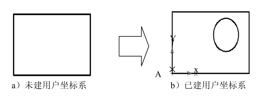 的提示下,选取矩形的角点A,此时系统便在此点处新创建一个图3.1.10b所示的用户坐标系。