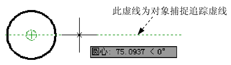 按钮都按下。在图3.4.2中已提前绘制了一个圆,如果要绘制一条直线,输入直线命令后,在系统提示指定第一点时,将鼠标光标移至圆对象的圆心附近等待片刻,当显示“圆心”提示时,表示圆心已被自动捕捉到,此时再慢慢地向右水平移动鼠标光标,系统即显示一条对象捕捉追踪虚线,并同时显示当前光标位置点与圆对象之间的特定关系