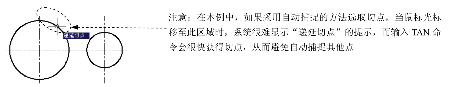 命令;输入命令TAN(切点捕捉命令)并按Enter键,然后将鼠标光标移至图3.5.6所示的区域附近,当鼠标光标附近出现“递延切点”提示时,单击即可获取大圆上的切点;参照上述操作方法,获取小圆上的切点;按Enter键,结束操作。