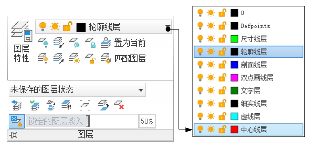 Step3. 将图层切换到“中心线层”。单击“图层”工具栏中的“下三角箭头”按钮。“图层”工具栏如图3.5.10所示,在系统弹出的下拉列表中选择“中心线层”项。