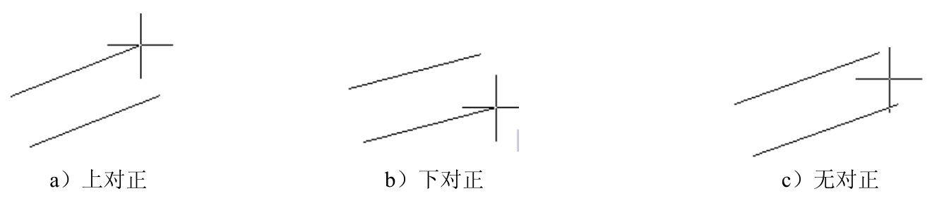 说明: 根据多线的绘制过程,从左至右绘制水平的多线时,光标在上为上对正(图4.2.5a),光标在下为下对正(图4.2.5b),在中为无对正(图4.2.5c)。