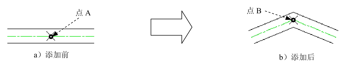 在选择“添加顶点”方式后单击图4.2.13a所示的多线上的点A,按Enter键结束命令。然后再选取多线,将多线上的点A移动至图4.2.13b所示的点B即可为多线添加顶点。