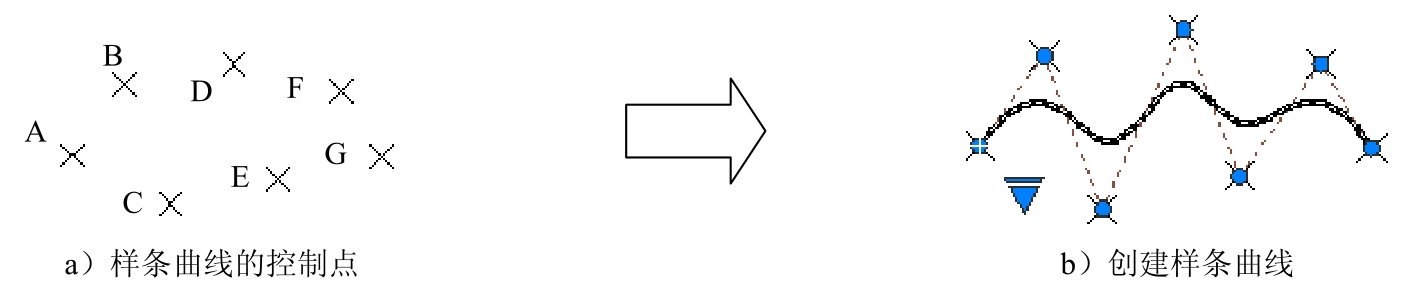 Step3. 指定样条曲线的各控制点。依次选取A、B、C、D、E、F、G七个控制点后按Enter键完成绘制。