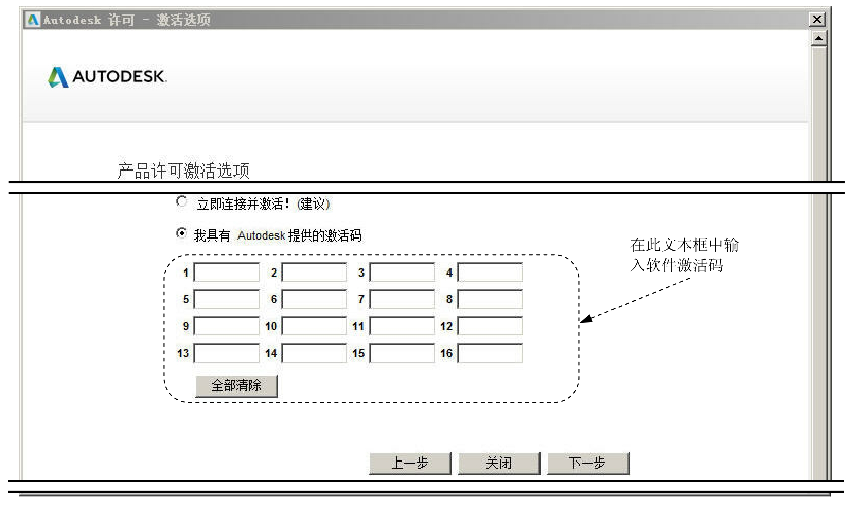 (1)在图1.2.2所示的“Autodesk许可-激活选项”界面(二)选中