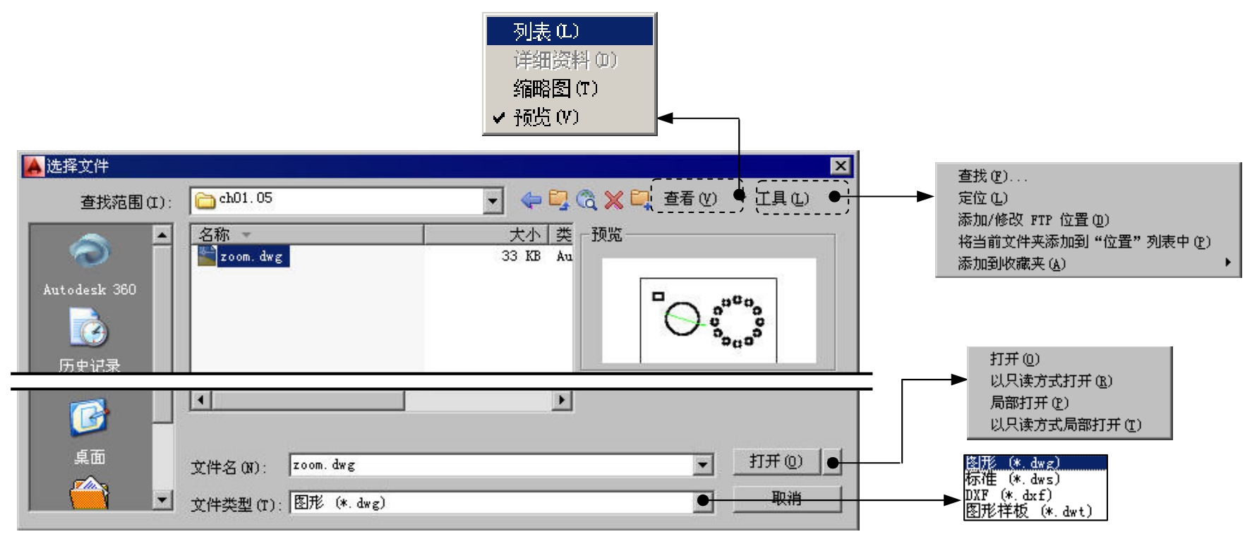区域中将显示出该图形的预览图像。在默认的情况下,打开的图形文件的类型为dwg类型。用户可以在图1.5.1所示的