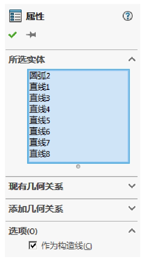 SolidWorks中构造线的作用是作为辅助线,以点画线形式显示。草图中的直线、圆弧、样条线等实体都可以转换为构造线。下面以图4.6.5为例,说明其转换方法。