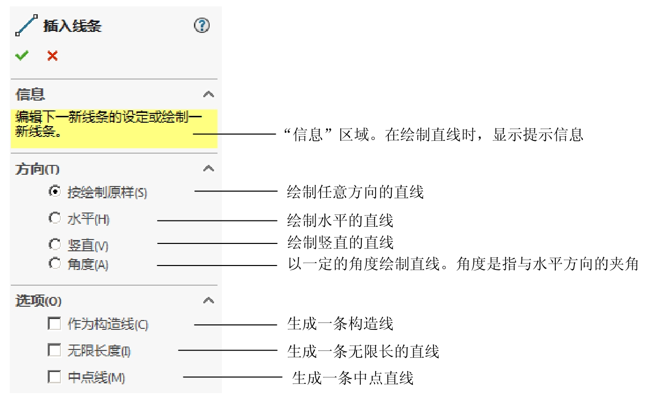 ● 在绘制直线时,“插入线条”对话框的“信息”区域中会显示提示信息;在进行其他命令操作时,SolidWorks工作界面的状态栏中也会有相应的提示信息。时常关注这些提示信息能够更快速、更容易地操作软件。