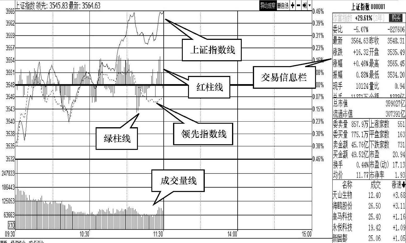 下面以上证指数为例介绍大盘情况。上证指数分时走势图,是把股票市场的一系列交易信息,实时地用曲线在坐标图上加以显示的一种技术图形。坐标的横轴表示交易时间,纵轴的上半部分是指数,下半部分显示的是实时的成交量,如图3-1所示。
