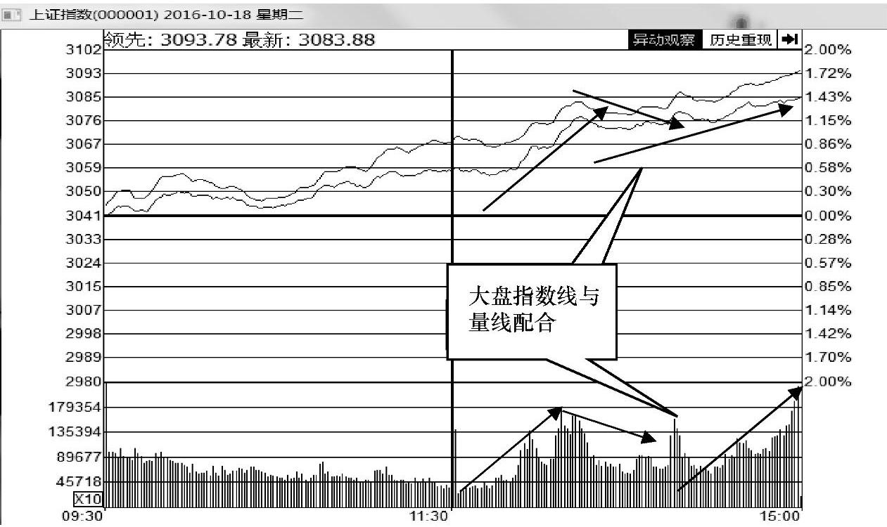 当大盘指数线处于上升形态时,量线同步拉长,则说明大盘指数的上行有足够的资金支持,未来走势向好;反之,若大盘指数线在上行时,量线并未同步拉长,则说明大盘的上行缺少足够的资金支持,未来走势并不乐观。