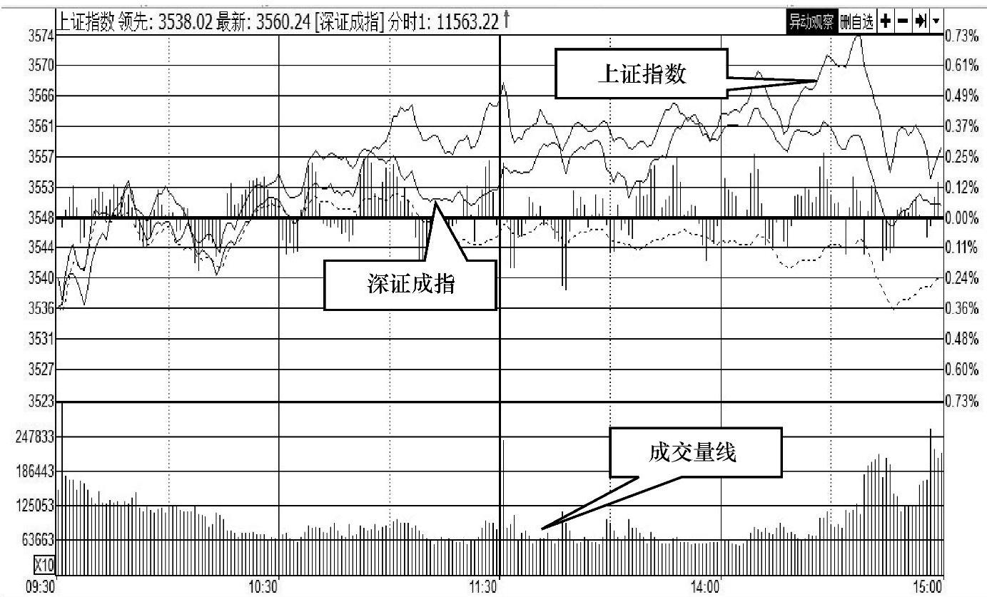 例如在图3-1中,上证指数线一直强于领先指数线,且两条指数线大多数时间都位于中间横轴上方,此种走势说明市场走势较强,大盘股在引领整个指数,而小盘股则相对处于弱势。从右侧“交易信息栏”中“涨跌家数”中可以看出,上涨家数要远远多于下跌家数。这更说明了市场的强势。