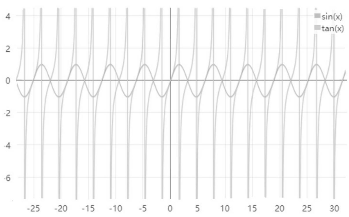 (2)函数周期性,函数图像周期性重复出现的性质,如正弦波、余弦波等,通常表述为 f ( x )= f ( x + T ), T 表示周期。例如,sin( x )的周期为2π,因此可用 f ( x )= f ( x +2π)表示。图1.30是借助软件绘制的sin( x )和tan( x )的曲线,可以看出其周期性。FooPlot是在线绘制函数图像的网站,读者可以在该网站尝试绘制各种函数的图像。