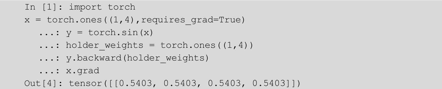 的值为1,所以最终的结果x.grad=holder_weights∗cos(x)=1∗cos(1)=0.5403。
