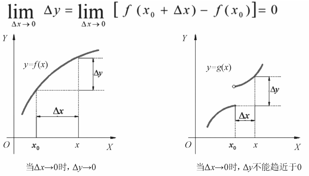 函数 y = f ( x )在 x 0 的某邻域内有定义,如果当自变量的改变量Δ x 趋于0时,相应函数的改变量Δ y 也趋于0,则称 f ( x )在 x 0 处连续,如图1.32所示。函数的连续性需要满足如下条件。