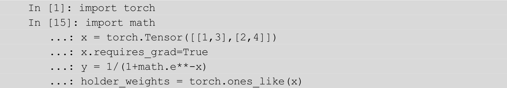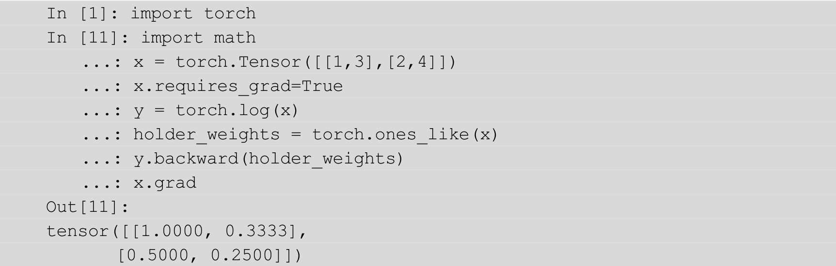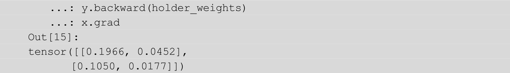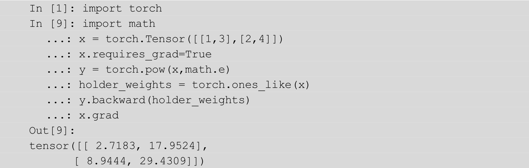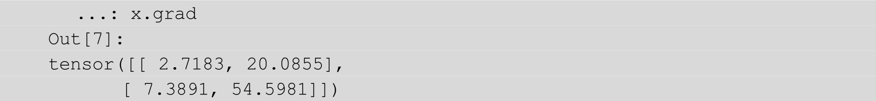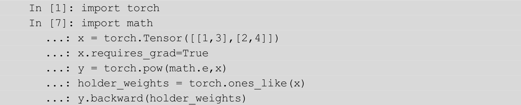 y =e x 的导数仍然为e x ,x.grad的计算公式为holder_weights×e x ,而holder_weights=1,因此最终的结果为[[e 1 ,e 3 ],[e 2 ,e 4 ]]。