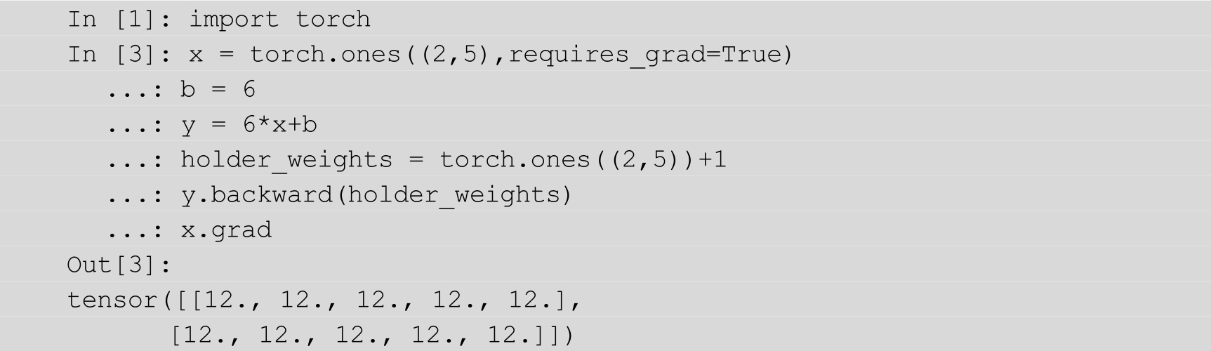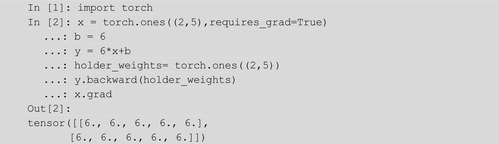 上面构建了一个一元一次方程y=6x+b,其中,输入x的形状为2行5列的矩阵,b为标量6,y是由x在“+”运算下创建的。Tensor的一条创建规则是,只要创建者中有一个Tensor的requires_grad=True,则所创建的Tensor的requires_grad也为True。因此,生成的变量y的requires_grad=True,在应用backward方法后,PyTorch的自动微分系统将自动计算导数,并将导数返回holder_weights,它是一个和输出y拥有相同形状的Tensor,可以将其视为带权重的偏导数接收器,它将计算得到的导数和自己相乘。由导数公式可知