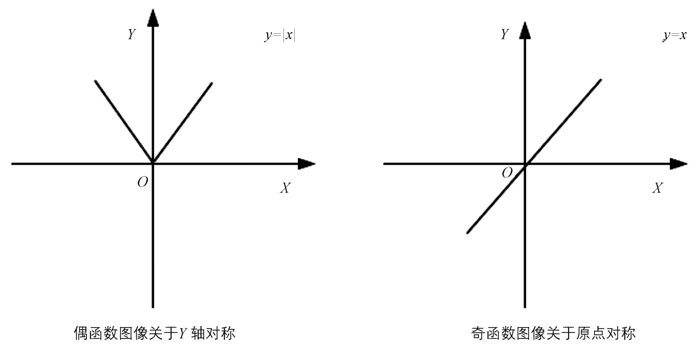 (1)函数奇偶性。该性质表述的是函数关于 X 轴或 Y 轴对称的性质,偶函数关于 Y 轴对称,因此有 f ( x )= f ( -x );而奇函数关于原点对称,因此有 f ( x )= -f ( -x )。例如, f ( x )= x 2 有 f ( -x )=( -x ) 2 = x 2 = f ( x );而 g ( x )= x 5 有 g ( -x )=( -x ) 5 = -x 5 = -g ( x )。函数奇偶性如图1.29所示。