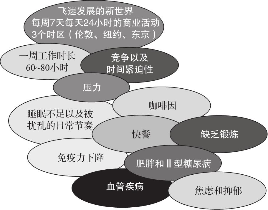 图1-1 一系列健康后果:在压力诱导、需求驱动和时间紧迫的经济环境(即消费社会)造成的一系列健康问题中,肥胖是最明显的