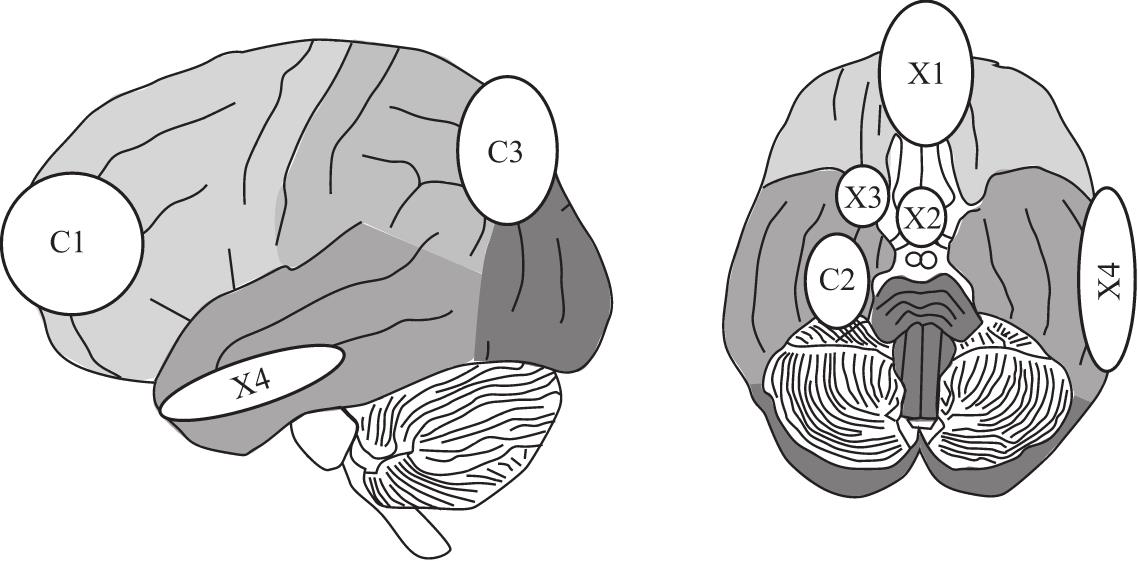 图2-2 在反射性思维(直觉)和反思性思维(意识)过程中活跃的神经区域。在有意识的反思性思维中活跃的区域包括外侧前额叶皮层(C1)、海马和内侧颞叶(C2)以及后顶叶皮层(C3)。在反射性的直觉思维过程中,大脑中腹内侧前额叶皮层(X1)、基底神经节(X2)、杏仁核(X3)和外侧颞叶皮层(X4)区域相互作用(本图基于马修·利伯曼的研究,经许可在此采用)