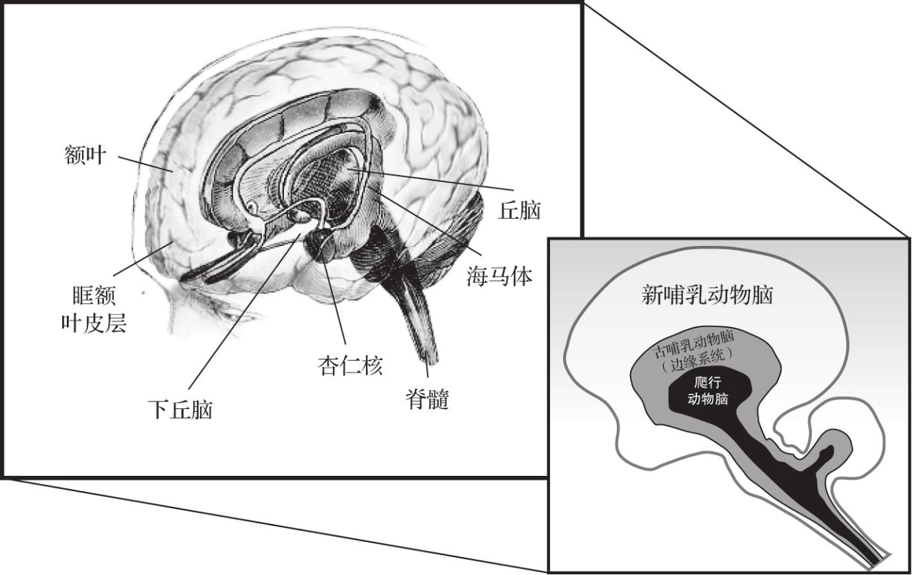 我们已经知道,人类的大脑和其他哺乳动物的大脑一样,是一种混合结构,本质上是一个由三个部分组成的层次结构,其独特的进化史决定了其生物特性(见图2-1)。
