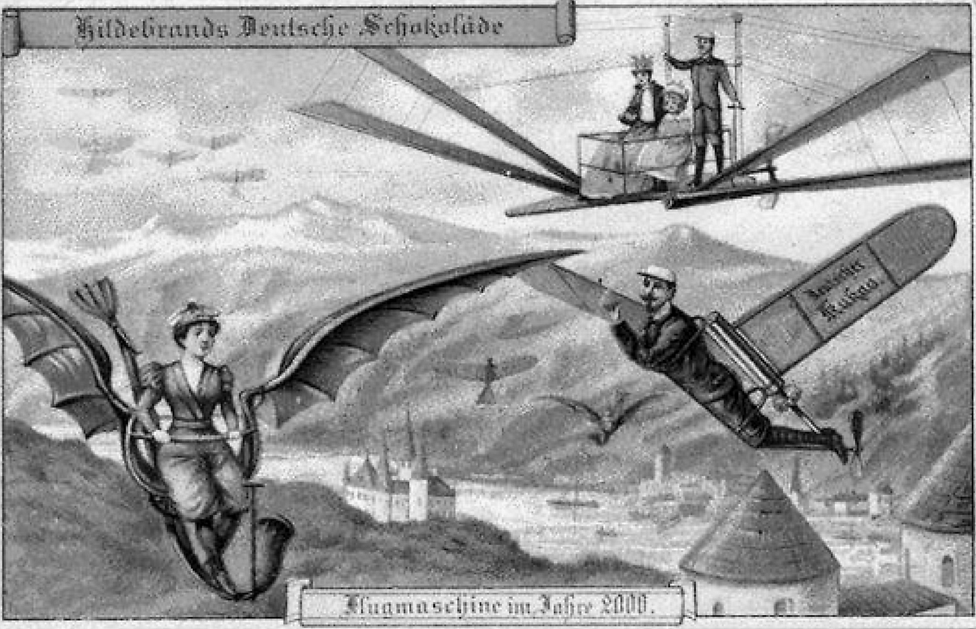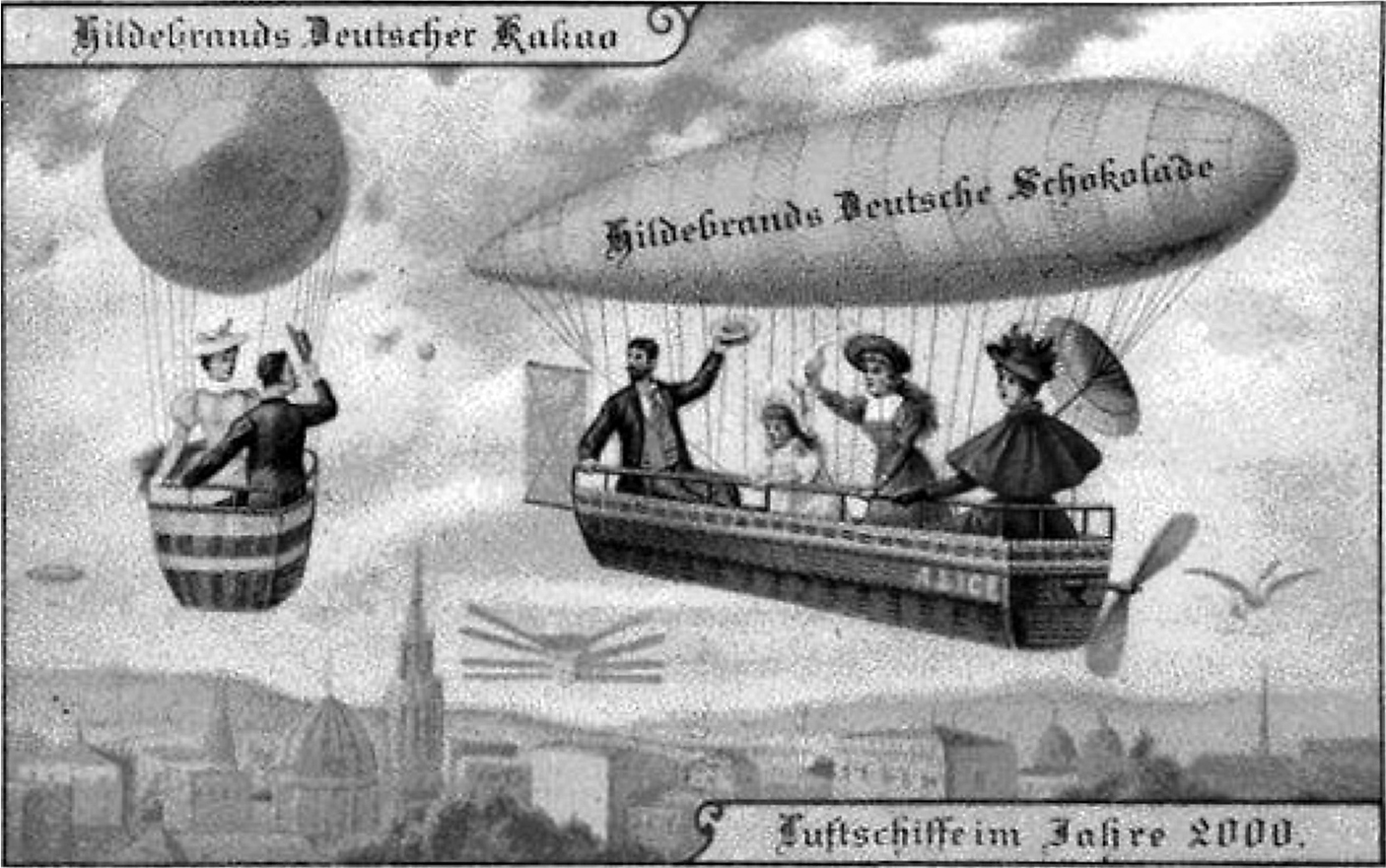 史学研究是波浪形前进的。自司马迁以来,宏大叙事与微观研究一直在交替出现;即便是近代以来,这样的现象依旧存在。这不以意识形态为转移,而是人类思维的普遍规律。摆脱史料话语权的中心主义,揣摩史料中“主观意识表达”之外的无意识心态才是目下当务之急。在这个过程中,微观研究不可或缺,甚至是目前的主要任务之一。在此笔者与诸位读者分享几幅图画,1900年德国巧克力公司Hildebrands绘制的“畅想21世纪”明信片,这里直观、生动地展示了什么是“主观意识表达”之外的无意识心态: