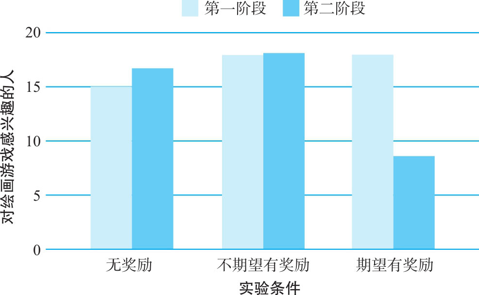 几天后,研究者把孩子重新带到实验室,给他们大量好玩的玩具,包括他们前几天玩过的绘画游戏。这一次,不给任何孩子奖励。结果发现,期望有奖励的孩子对绘画游戏的兴趣远低于不期望有奖励的孩子,如图0-1所示: