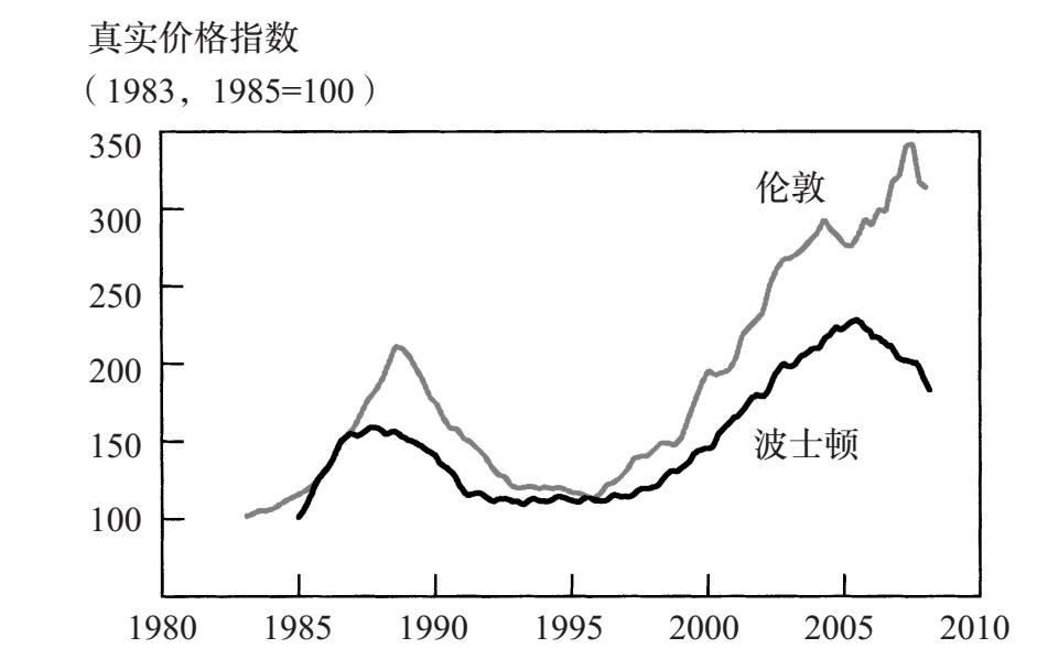 伦敦1983年第一季度至2008年第一季度的季度住房价格的计算是用哈里法克斯住房价格指数除以英国零售价格指数。美国1983年1月至2008年3月的月度价格的计算是用标准普尔/凯斯–席勒住房价格指数除以消费者价格指数
