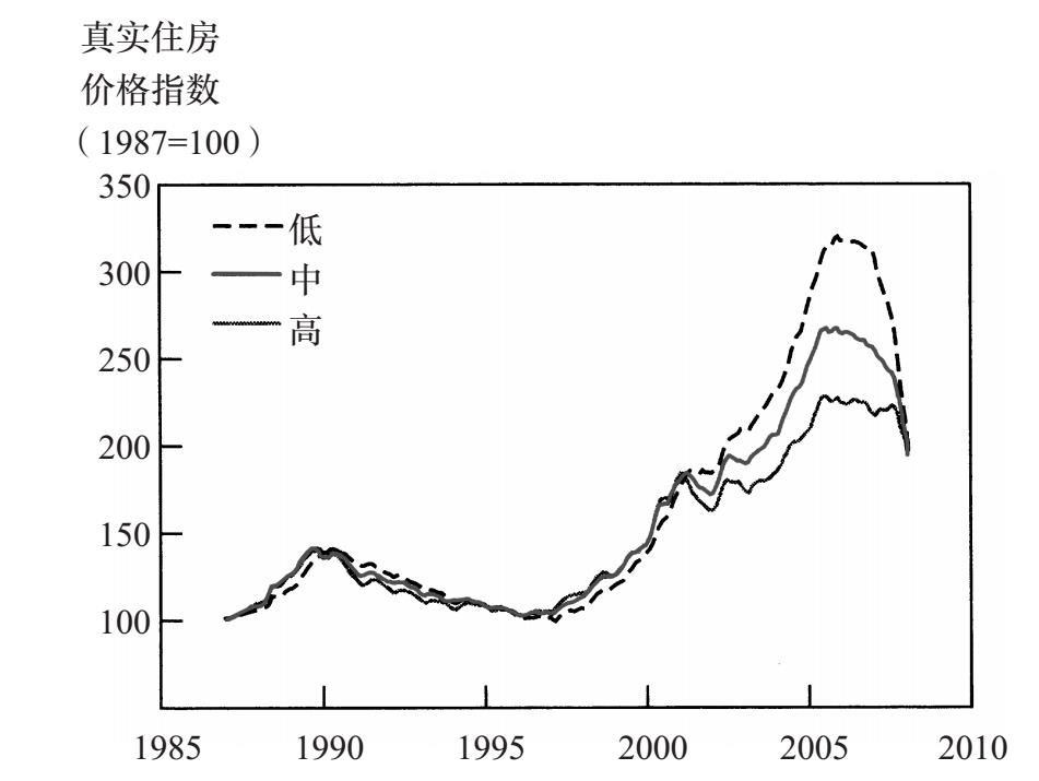 经过最低价格区间,市场在最近的繁荣中表现出了最大的涨幅,并且一直持续到2006年,之后出现了最大的跌幅。同样的现象可以在其他很多城市中观察到。对于导致这种价格区间差异的原因,我们目前了解得还不是非常透彻,但是次级抵押贷款现象是一个可以用来对此进行解释的很好的理由。住房价格急剧上涨的原因是自2001年起出现的次级抵押贷款规模的快速膨胀,这些快速增加的贷款被提供给了那些低收入购房者,并用于资助他们购买低价住房和其他相关的投资工具。2006年的繁荣期见顶后,低价住房价格的较快下跌与该市场出现还款拖欠和丧失抵押物赎回权的问题也是同步的。