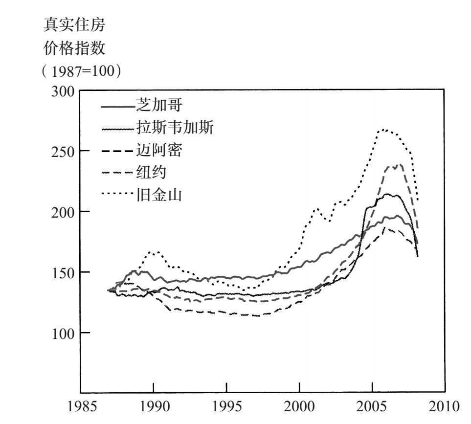 始于20世纪90年代末的美国房价暴涨似乎是史无前例的,但事实上并不是真的“史无前例”,你只要研究一下各个具体城市的情况就知道,某些城市住房市场历史上曾出现非常壮观的繁荣景象。但在最近的这一波繁荣浪潮中,有幸经历这种繁荣的城市的数量在急剧增加。图1–2给出了主要都市区域的一些例子,同样也用标准普尔/凯斯–席勒住宅价格指数对价格数据进行了通货膨胀修正。数据揭示了不同城市价格走势的差异。不动产市场仍然是区位依赖型的市场。但是,尽管2006年见顶前不同城市间存在差异,但所有这些价格现在无一例外地正在下跌,下跌的速度大致与上涨的速度成反向等比。数据显示,与相对价格比较稳定的芝加哥和纽约等城市比较起来,拉斯韦加斯、迈阿密和旧金山等城市的房价都具有在2006年以前涨速较快,同时后期的跌速也较快的特点。