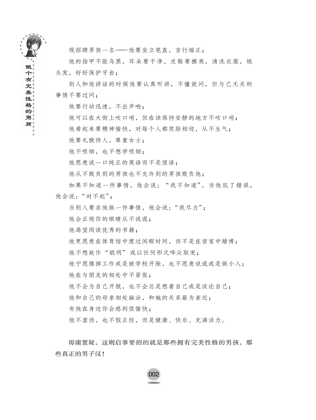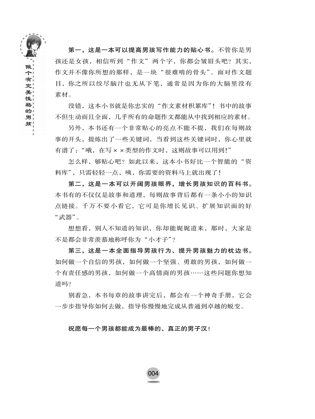 书名:做个有完美性格的男孩 作者:文轩 排版:何基才 ISBN:9787505430266
