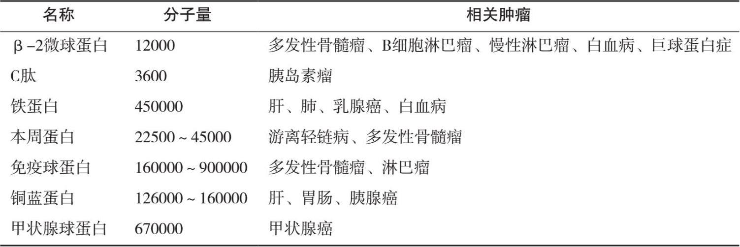 蛋白类肿瘤标志物是最早发现的肿瘤标志物类型。常见的标志物如:微球蛋白、免疫球蛋白等均属于此类。一般来讲这类标志物特异性较差,但检测方法相对比较容易,故一般作为常规检测项目(见表1.6)。