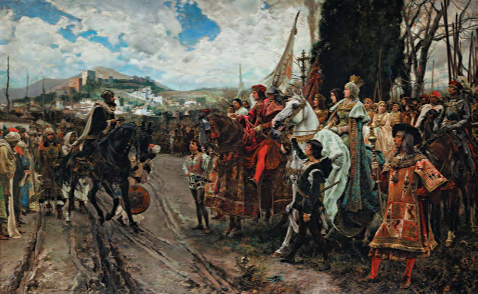 《收复格拉纳达》(Francisco Pradilla Ortiz ,1882年)。穆罕默德十二世(天主教徒称之为Boabdil )向阿拉贡国王费迪南和卡斯提尔女王伊莎贝拉投降[参见第48章]