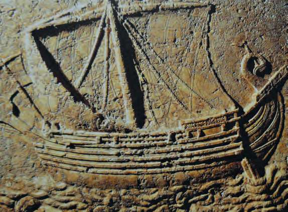 腓尼基人的船(石棺浮雕,公元2世纪)。腓尼基人自称“迦南人”,是一个生活在地中海东岸(今黎巴嫩一带)的古老民族,以善于航海与经商而著称于世[参见第17章]